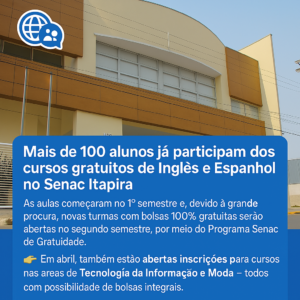 7 de abril de 2025Senac Itapira abre novas turmas gratuitas em Inglês, Espanhol, TI e Moda